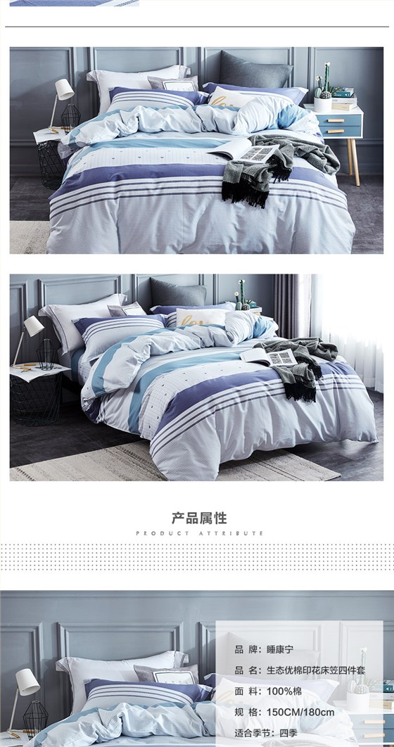 被里材质: 棉 被面材质: 棉 成分含量: 100% 图案: 竖条/格子 风格: 简约 件数: 4件 颜色分类: 韵律 适用床尺寸: 1.5m(5英尺)床笠款 1.8m(6英尺)床笠款 1.2m(4英尺)床笠款 产品等级: 合格品 床品工艺: 绗缝 面料支数: 40支 面料密度: 128x70 货号: 韵律 印花工艺: 涂料印花 织造工艺: 斜纹